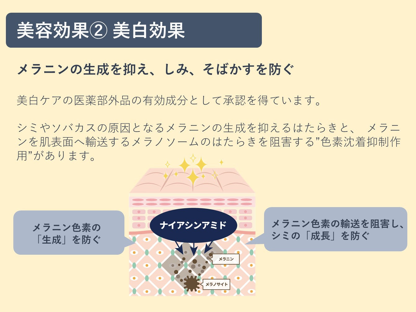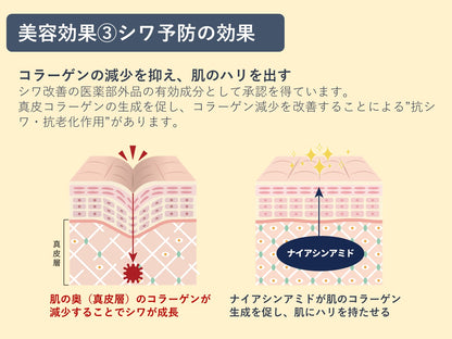 ナイアシンアミドとは「ビタミンB3」の一種です。肌荒れ、乾燥、キメ、つや、ハリのお悩みへの美容成分として知られています。医薬部外品の有効成分として厚生労働省が認可した成分で、化粧品と医薬品の中間に位置します。
