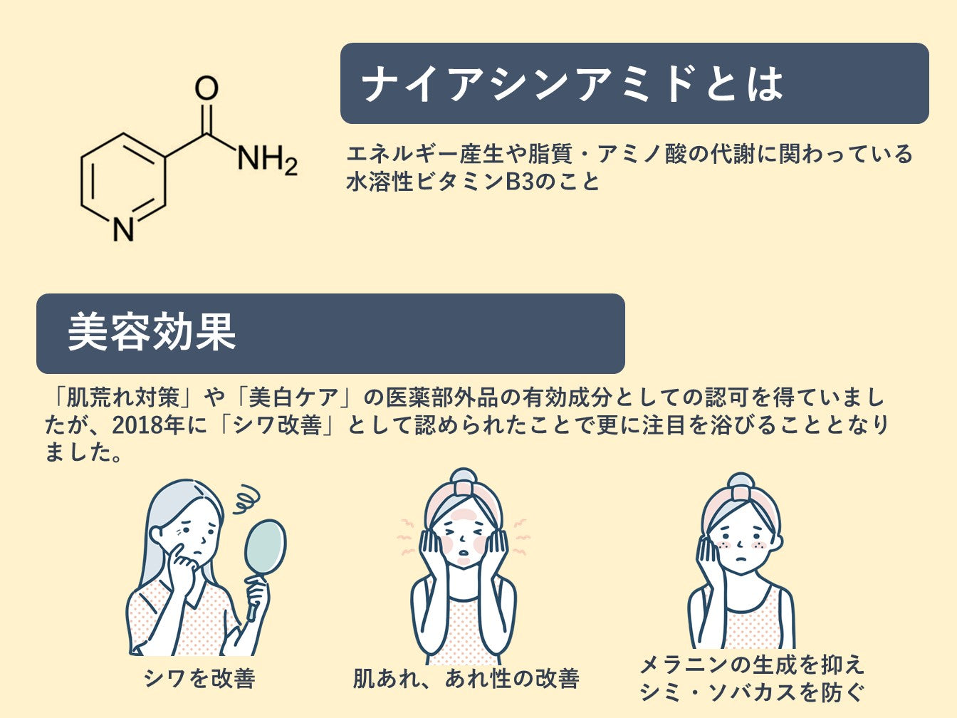 ナイアシンアミドとは「ビタミンB3」の一種です。肌荒れ、乾燥、キメ、つや、ハリのお悩みへの美容成分として知られています。医薬部外品の有効成分として厚生労働省が認可した成分で、化粧品と医薬品の中間に位置します。