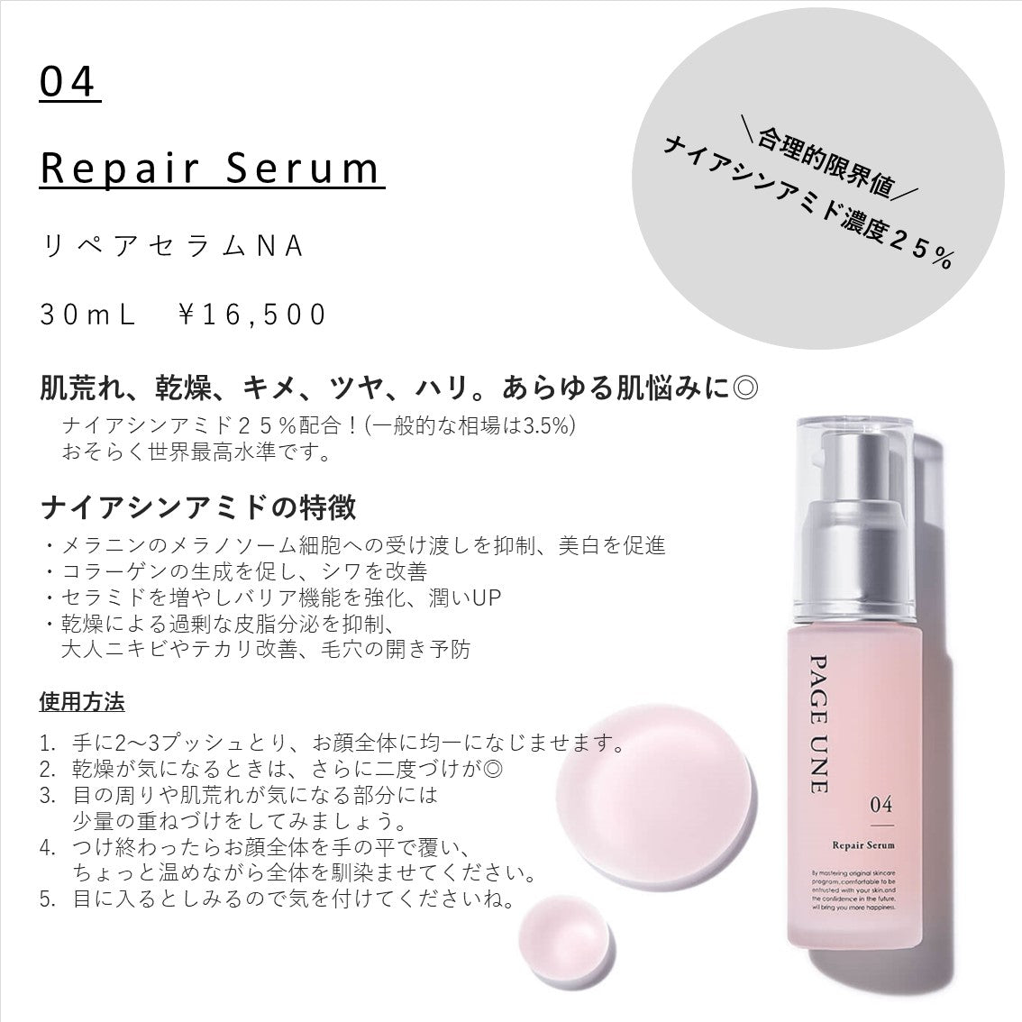 このリペアセラムではナイアシンアミドを25%配合しています。おそらく世界最高水準です。
