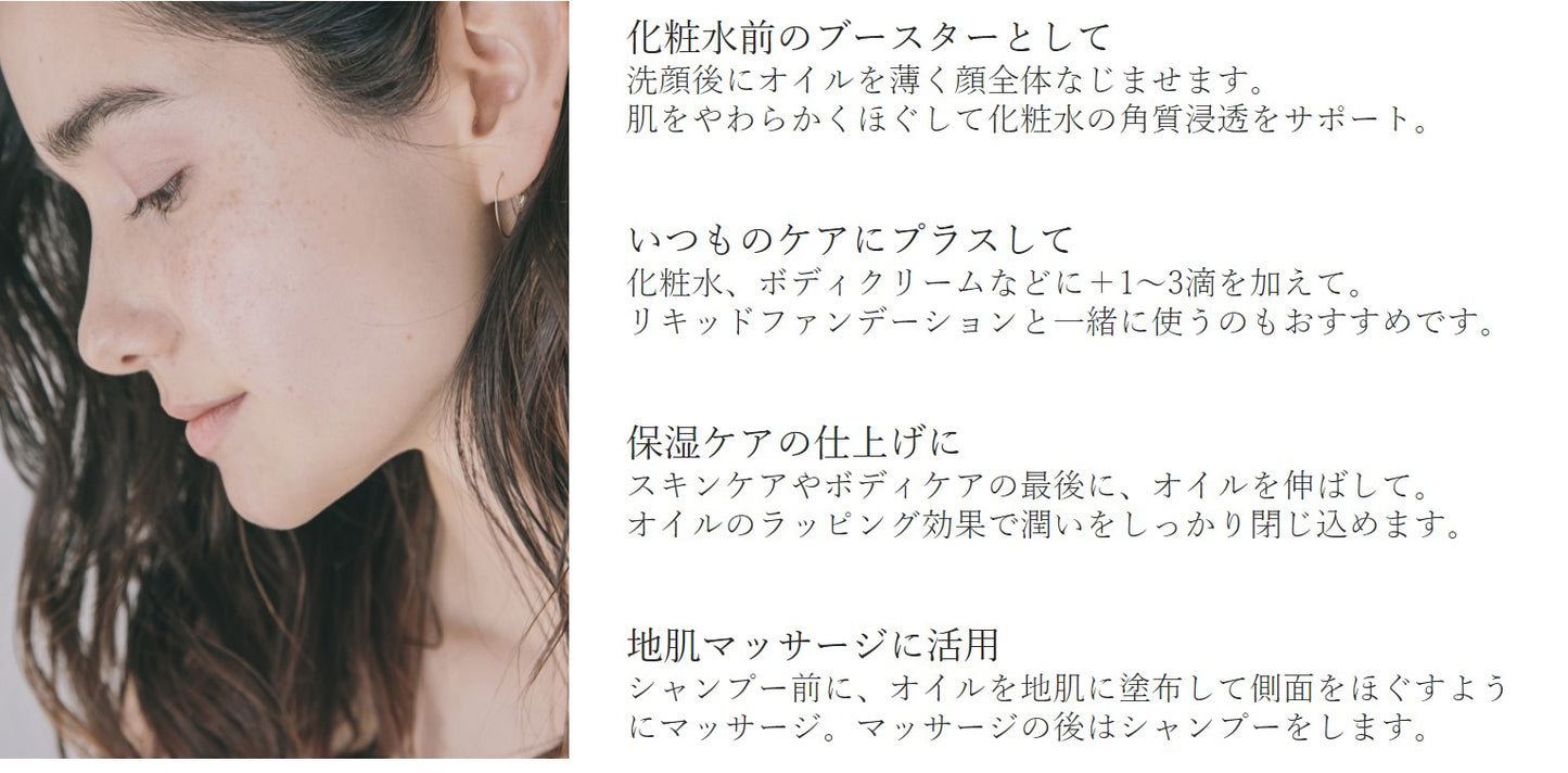 肌と髪をしっかり保湿する「全身美容オイル」です。濃密なアスタキサンチンをはじめとした厳選された美容成分と植物オイルで高濃度保湿。地肌と髪を濃密な潤いで包み込みます。美容成分を凝縮した濃厚さでありながら、伸びがよくベタつかない、とても使い勝手のよいオイルです。乾燥による小じわを目立たなくする(効能評価試験済み)