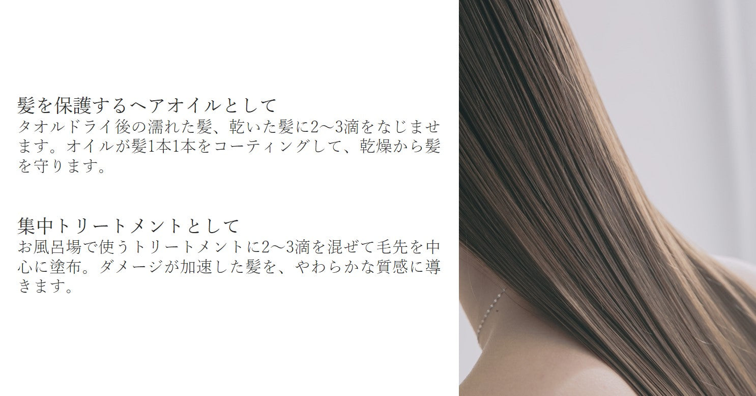 常温で固くなる飽和脂肪酸が多く含まれていないことから、しっかり目のヘアセットを目的にすると、少し”ゆるい”と感じるかと思います。しかし、保湿能力が非常に高いオイルなので、その分”しっとり感”は持続し、狙ったスタイルを長時間楽しめます。